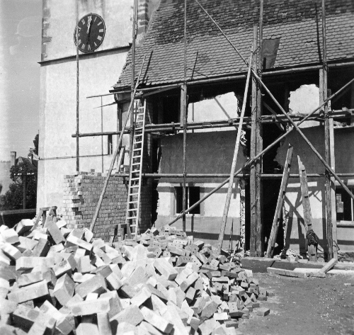 Gerüstarbeiten beim neuen Anbau neben dem Gefallenen-Denkmal.