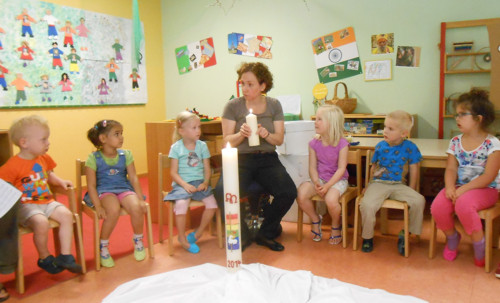 Jede Kindergartengruppe stellte dann auch noch ihre eigene Gruppenkerze her, die wir nun immer anzünden können, wenn wir Geschichten von Jesus hören.