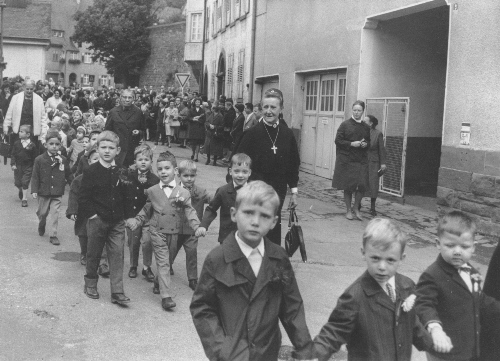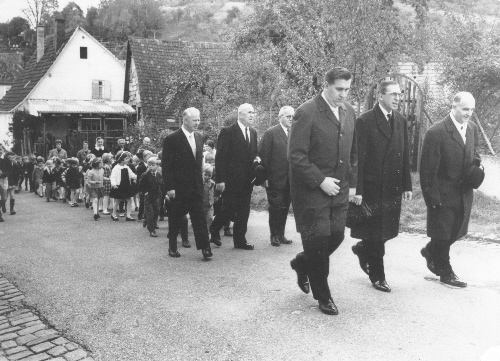 Kinderfestumzug in der Bahnhofstraße. Bürgermeister Kugel, Prälat Wallach und Dekan Braun (1. Reihe von links). Ältester Langermann, Ältester Volle und Abgeordneter i. R. Leonhardt MdB (2. Reihe von links).
