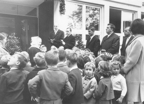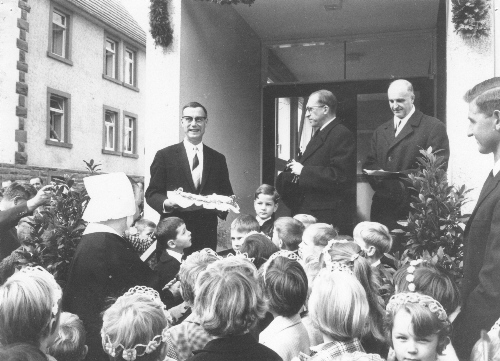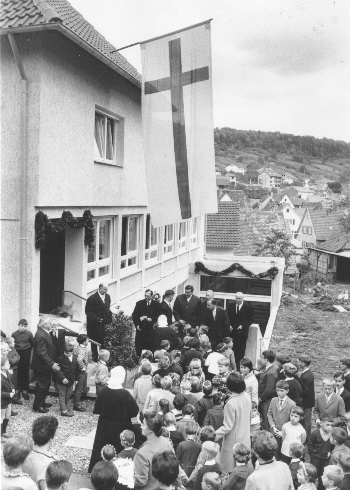 Die öffentliche Gemeindehauseinweihung vollzog um 14 Uhr Oberkirchenrat Hammann in einem Festakt, der mit einer Ansprache des Architekten vor dem Haus begann und im neuen Saal nach kurzer Begrüßung und Danksagung an alle am Bau beteiligten und vielen Grußworten von Behörden und Gemeinde - auch von unserem alten Dekan Hauß - mit Lob und Dank gegen Gott schloß. Eine Hausbesichtigung und eine Kaffeetafel mit Darbietungen der Jugenscharen - zwei fleißig vorbereiteten und prächtig dargebotenen Spielen - beendeten den Freudentag der Gemeinde. Am 25. Oktober begann der Betrieb in den Kindersälen."