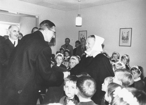 Im neuen Kindergarten. Prälat Wallach dankt Schwester Babette.