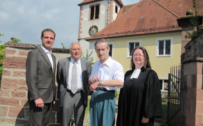 Bürgermeister Ulrich Pfeifer, KGR-Vorsitzender Theo Mosser, Joachim Rau und Pfarrerin Bettina Ott.