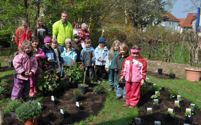 Den Erzieherinnen war es wichtig, mit den Kindern gemeinsam von Anfang an alle Arbeitsschritte zu planen und durchzuführen. So wurde im Frühjahr eine Projektgruppe "Garten" eingerichtet, zu der sich eine überwältigende Anzahl der Kinder freiwillig meldeten, die mithalfen und mitgestalteten. Unterstützung gab es auch von einigen Eltern, den Mitarbeitern des Bauhofes Keltern und dem Zivildienstleistenden.