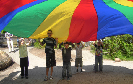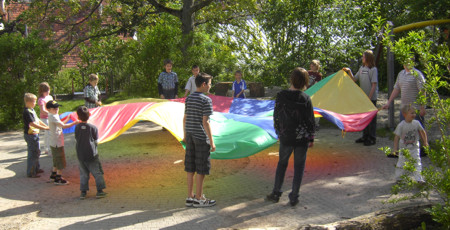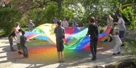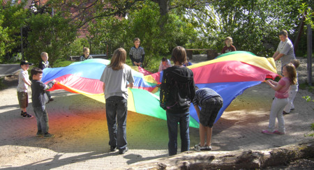 Fallschirmspiele im Hof des Oberlinhauses.