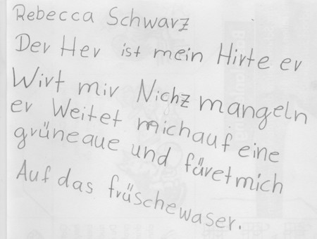 Rebecca Schwarz (2. Klasse) fiel zum Thema "Gebet" der Beginn des 23. Psalms ein und sie hat ihn für sich aufgeschrieben. Abdruck mit freundlicher Genehmigung.