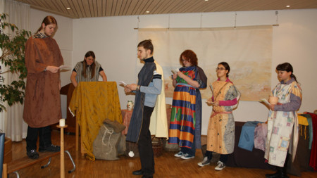 Beim Kinder-Bibel-Sonntag am 27. Februar 2011 ging es um das Thema "Neid" und die Frage "was ich gerne haben möchte". Hierzu erleben die Kinder die Geschichte eines Verkäufers auf einem historischen Markt, der vor lauter Geldgier die Kunden betrogen hatte, bis eines Tages der Prophet Amos auftauchte und die Unehrlichkeit der Menschen offen aussprach. Vor einer tollen Theaterkulisse haben unsere jugendlichen Schauspieler die Geschichte spannend nachgespielt, so dass es im Saal mucksmäuschenstill war.