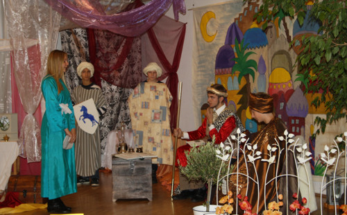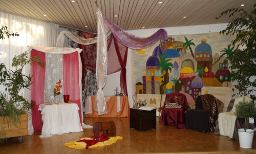 Eine riesige orientalische Stadtkulisse und der Palast des Perserkönigs Ahasveros bilden das Bühnenbild während der Kinderbibelwoche 2012 in den Herbstferien und begeistern die insgesamt 70 Teilnehmenden und Mitarbeitenden gleichermaßen. Die jugendlichen Mitarbeiterinnen und Mitarbeiter lassen in eindrücklichen Theaterszenen die Zeit um 500 v. Chr. lebendig werden. Der mächtigste Mann der Welt ist der persische König. In dieser Zeit wird die junge Jüdin Esther zu seiner Frau ernannt. Mutig schafft sie es, eine Verschwörung gegen den König aufzudecken und Unheil von ihrem Volk abzuwenden. Die ganze faszinierende Geschichte findet sich im Alten Testament im Buch "Ester". Das jüdische Purimfest, das bis heute gefeiert wird, geht auf diese Grundlage zurück. Es ist ein Fest der Freude, über Gott, der gegen allen Anschein seine Hände im Spiel hat und letztendlich die Welt regiert.