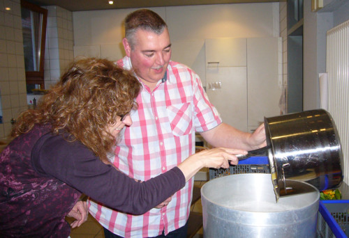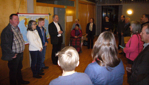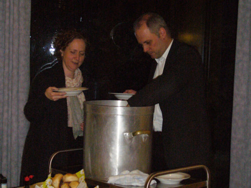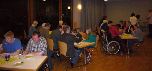 Die Gemeinschaft aus gemischten Altersklassen von 17 bis 80 Jahren begab sich im Anschluss zum katholischen Gemeindehaus. Dort dampfte eine von Harald Ulmer in Unterstützung von Rita Müller (also ökumenisch) zubereitete Fastensuppe (Kartoffelsuppe). Nach einem gemeinsamen Kanon unter Leitung von Pfarrer Dr. Mette wurden die Teller mit großem, Schöpfer gefüllt und gemeinsam gespeist.