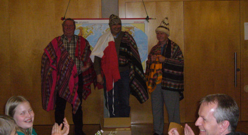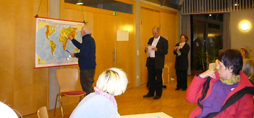 Die Beiträge gingen von einfachen Fragen über detaillierte Berichte, Zahlenspiele zu Landesgröße / Einwohnerzahlen / Entfernungen bis hin zu Trachtenvorführung, Pantomime und musikalische Beiträge. In regem Austausch wurde diskutiert, Antworten geboten und stets in strengem Einhalten der Regeln gewetteifert. Eine Weltkarte füllte sich zusehends im Lauf des Abends mit Klebeschildchen auf diversen Ländern. Eine Siegergruppe nach Punkten gab es am Ende mit einem halben Punkt Vorsprung, doch Sieger des Abends waren alle Teilnehmer. Bestens gelaunt und an Wissen bereichert trennte man sich nach einem außergewöhnlichen, abwechslungsreichen und harmonischen Abend.