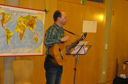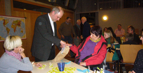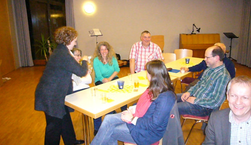 Die Tische wurden abgeräumt und Sitzplätze neu gemischt: in drei Gruppen nach den Farben der in der Andacht ausgeteilten Liedzettel. Die Moderatoren Pfarrerin Lieb und Pfarrer Dr. Mette erklärten die Spielregeln für das "Weltspiel": Mit insgesamt 21 Fragen, Darstellungen und Beiträgen konnte im Wechsel jede Gruppe Antworten finden, die im Bezug zu den Kirchengemeinden vor Ort sowie Beziehungen dieser zur Welt stehen.