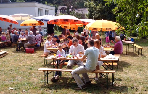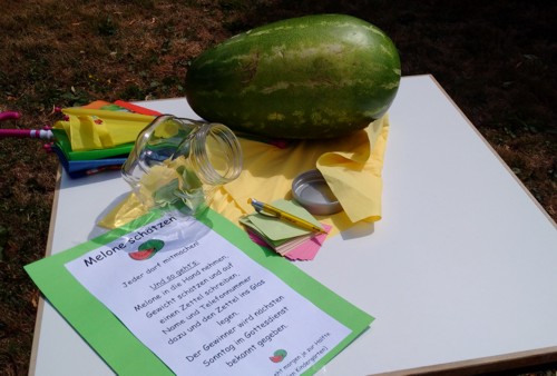 Nach dem Gottesdienst ging es dann doch noch in den Pfarrgarten und die Regenschirme wurden zu Sonnenschirmen umfunktioniert. Bei schönem Wetter, leckerem Essen, netter Gesellschaft und einem lustigen Melonenschätzspiel hatten alle ihren Spaß und freuen sich auf den nächsten Familiengottesdienst.