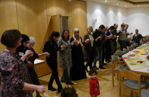 Am Silvesterabend kamen im Oberlinhaus über 60 Menschen zu einem fröhlichen Fest der Begegnung zusammen. Alle hatten etwas zu Essen mitgebracht und so entstand ein leckeres deutsch-syrisch-kurdisches Buffet. Für die Kinder und Jugendlichen gab es verschiedenste Spiele. Intensive Gespräche wechselten sich ab mit traditionellen syrischen und kurdischen Tänzen. Wir haben viel gelacht - nicht zuletzt über unsere "Sprachkapriolen".