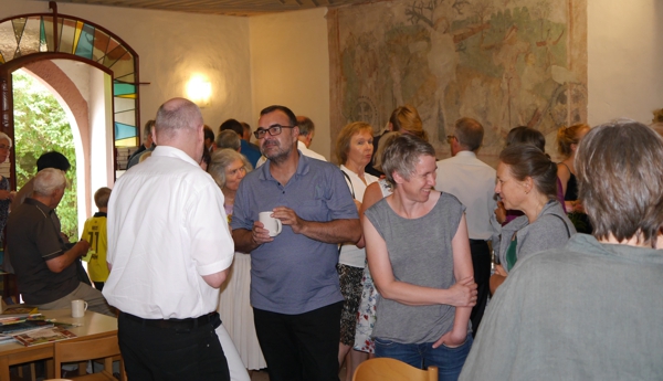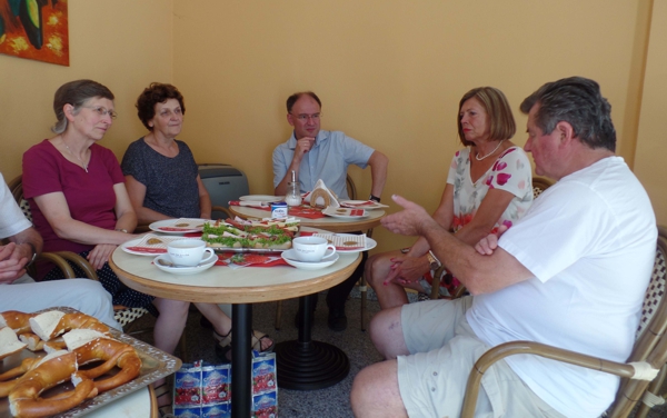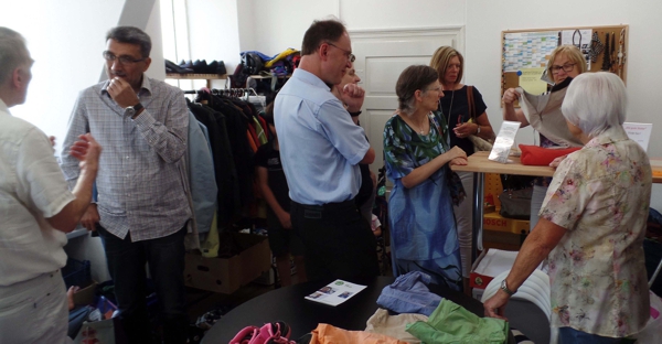 Während eine Flüchtlingsfamilie gerade einen Buggy und Kleider erwarb und ein Mädchen nach einem Schulranzen suchte, erzählten uns die Mitarbeiterinnen der guten Stube von ihrer Arbeit. Die Besucher aus dem Kirchenbezirk wollten wissen, wie die Nachfrage ist, ob auch Dietlinger hier etwas kaufen, wie die Zusammenarbeit zwischen den kirchlichen Gemeinden und der politischen Gemeinde klappt. Wo es Probleme gibt. Voller Bewunderung für dieses Projekt brach die Kommission dann wieder ins Pfarrhaus auf. Beim gemeinsamen Kaffeetrinken wurden viele der beim Besuch angeschnitten Themen noch einmal vertieft.