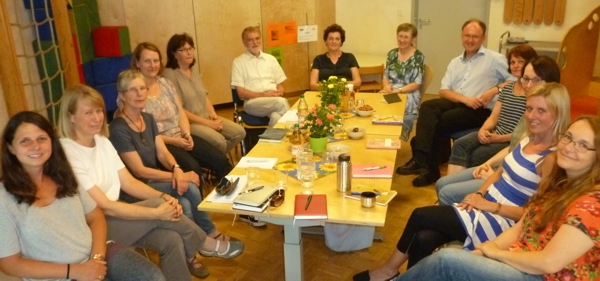 Um sich über die Kindergartenarbeit der Kirchengemeinde zu informieren, traf sich die Kommission am frühen Abend mit den Erzieherinnen des Uhlandkindergartens. Sie zeigten den Kindergarten und berichteten aus ihrer Arbeit. Im Anschluss daran sprachen Stefan Vetter und Martina Lieb aus dem Kindergartenausschuss mit der Kommission.