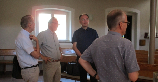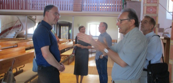 Zur Visitation gehört auch die Besichtigung der Gebäude einer Kirchengemeinde. So ging es nach dem Besuch im Rathaus in der Kirche weiter. Erich Bolz erzählte der Kommission etwas zur Geschichte der Kirche und zur Kirchenrenovierung. Im Anschluss daran ging es auch um die ausstehende Restaurierung oder Neugestaltung von Kreuz und Altar. Zum Abschluss spielte Dekan Glimpel noch auf der Orgel. Danach ging es weiter ins Oberlinhaus.