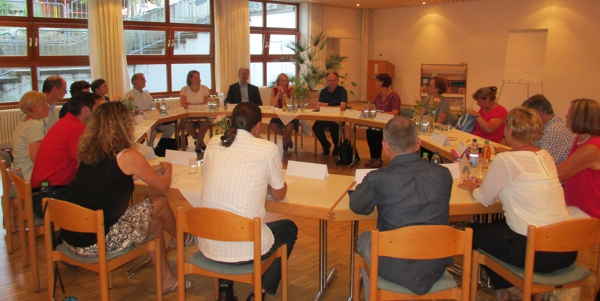 Am Abend hatte Schuldekanin Katharina Vetter Bürgermeister Steffen Bochinger, Vertreter des Gemeinderates, Volker Schneider, den Schulleiter der Grundschule und die Lehrkräfte der Fachschaft Religion, die Leitungen der Kindergärten, den Kirchengemeinderat und natürlich die Visitationskommission zu einem Rund-Tisch-Gespräch zum Thema Werte und Bildung eingeladen. Zu Beginn entstand ein Werteladen, in den jeder einen Gegenstand legte, der zum Ausdruck bringt, welchen Wert Bildung für ihn hat. Nach einem geistlichen Impuls der Schuldekanin erzählten Schulleiter Volker Schneider, Sabine Reister, die Leitung der Kita Farbklecks und Christiane Bach und Pfarrerin Martina Lieb über die Chancen und Herausforderungen in der Kinder- und Jugendarbeit. Im Anschluss daran gab es einen sehr intensiven und wertvollen Austausch über das, was Kinder- und Jugendarbeit in Dietlingen brauchen könnte. Am Ende waren sich alle Beteiligten einig: Das machen wir mal wieder.