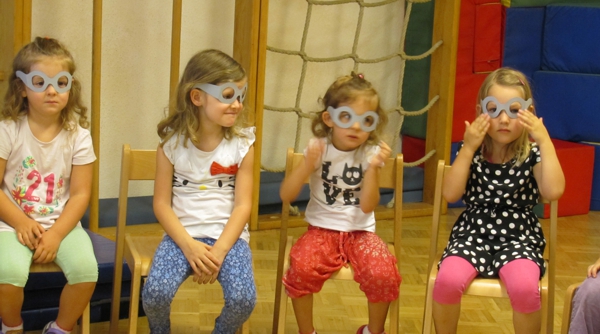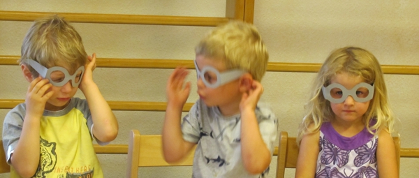 Im Kindergartenprojekt: Hat Gott ein Brille ging es um die Jesusbrille. Eine Brille durch die man mit dem Herzen sehen kann. Anhand der Geschichte von der Segnung der Kinder erzählten Bodo und Frau Lieb, dass Jesus die Kinder ganz anders anschaut, als die Erwachsenen. So wie sie sind hat er sie lieb. Diesen Blick des Herzens sollen wir nachmachen. Dafür bekam jedes Kind eine Brille und konnte diesen Blick Gottes durchs Herz üben.