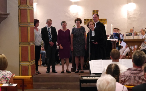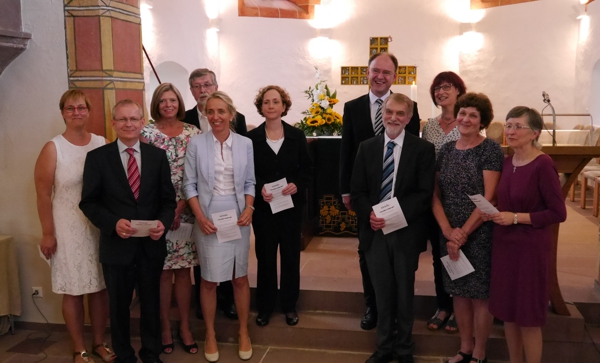 Der Kirchengemeinderat: (linke Seite von links) Daria Burger, Stefan Vetter, Ursula Schlegel, Wolfgang Raupp, Michaela Haas, Pfarrerin Martina Lieb. Es fehlt Verena Deckert. - Die Visitationskommission: (rechte Seite von links) Dekan Dr. Christoph Glimpel, Schuldekanin Katharina Vetter, Pfarrer Matthias Götz, Bezirkskirchenrätin Angela Ochner und Bezirkskirchenrätin Gerlinde Zachmann.
