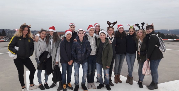 Anschließend sind wir auf den Hubschrauberlandeplatz des Krankenhauses gegangen. Es war sehr beeindruckend und wir haben tolle Bilder gemacht. Da Nikolaus war, haben wir allen Mitarbeitenden des Krankenhauses kleine Schokoladennikoläuse geschenkt und uns so für Ihre Arbeit bedankt. Wir durften in verschiedene Räume gehen: Den Kreißsaal, den Operationsraum, die Bettenzentrale, die Röntgenabteilung. Dabei haben wir verschiedene Fragen gestellt. Im OP-Raum haben wir OP Mützen im Weihnachtsdesign geschenkt bekommen, die wir sogar noch auf dem Rückweg im Bau aufhatten.