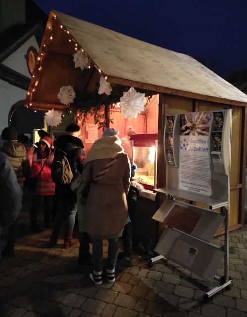 Am 3. Dezember beteiligten wir uns mit einem Infostand am Dietlinger Nikolausmarkt. Der Duft von frischem Popcorn und leckerem Punsch lockte viele Besucher*innen des Marktes zu unserer Hütte. So konnten wir für unser Projekt "Gemeindediakon*in für die Jugendarbeit" werben und am Ende des Tages den Stand des Spendenkontos um 300 Euro erhöhen.