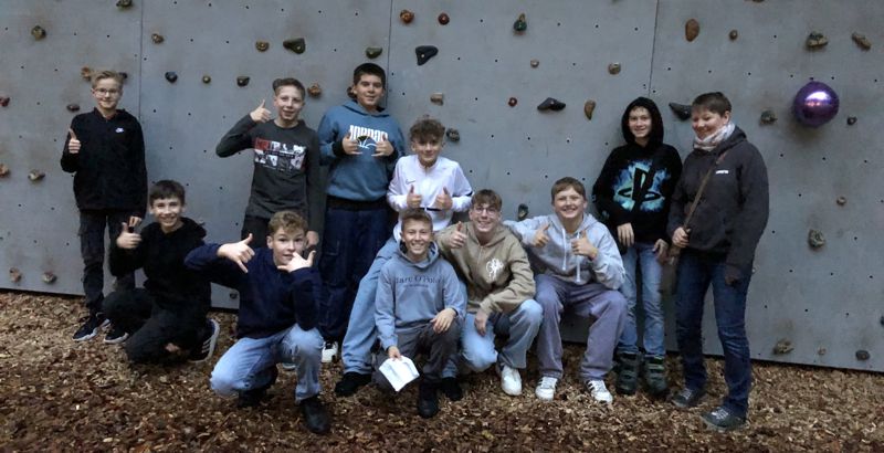 Nachmittags wurden wir als Gruppe losgeschickt und konnten draußen an Stationen Teamspiele machen. Die erste Station bestand darin, dass erst jeder allein durch ein geschwungenes Seil laufen musste. Dann sollten wir zu zweit, dann zu viert und zum Schluss alle zusammen durchlaufen. Wir haben fast nicht gestritten, wenn etwas schief ging. Bei der zweiten Station sollten sich alle auf eine Plane stellen und diese umdrehen ohne dass eine oder einer die Plane verlässt. Es war sehr schwierig. An Station 3 musste man mit Seilen, die an einem Rohr befestigt waren, einen Ball ein kleines Stück transportieren. Man hat für alle Stationen gutes Teamwork gebraucht und es hat sehr viele Spaß gemacht. Es war sehr kalt. Am Ende mussten wir noch als Gruppe durch ein Spinnennetz klettern.