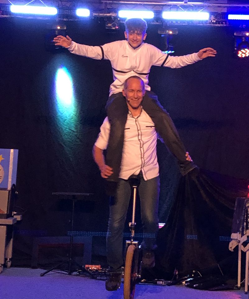 Abends kam der Zauberer und Illusionskünstler Mr. Joy. Mit seinen Illusionstricks hat er uns alle verzaubert. Er hat Ringe ineinander gekettet, jongliert und dabei immer von Gott erzählt, der uns lieb hat. Als Mr. Joy Moritz auf die Bühne geholt hat, ist er auf ein Einrad gestiegen und Moritz war auf seinen Schultern. Dann hat er noch einen Konfi zersägt und uns ist allen das Herz stehengeblieben. Insgesamt war es ein sehr schöner Abend und wir sind alle verwirrt und verzaubert ins zum Nachprogramm gegangen. Es gab Cocktails, Disco, Lagerfeuer mit Stockbrot und Marshmallows. Am Lagerfeuer war eine tolle Atmosphäre und es hat sehr gut geschmeckt.