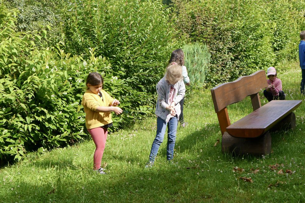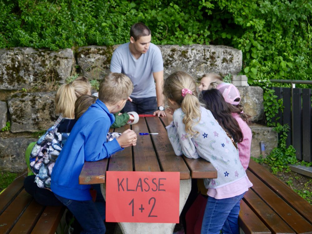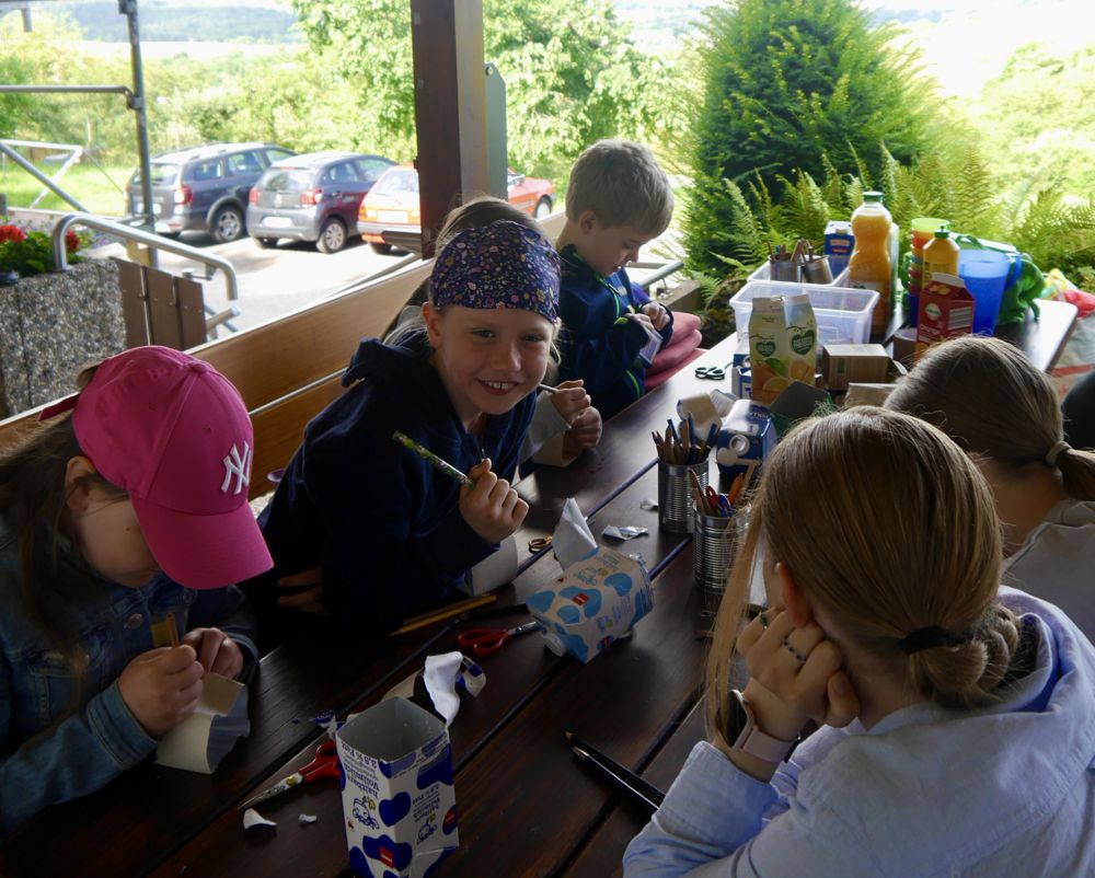 Auch der Zeitreisende Agur war dabei und thematisierte in einem spannenden Anspiel verschiedene Erzählungen der Schöpfungsgeschichte. Im Anschluss durften die Kinder der 1. und 2. Klasse Blumen auf einem Klebearmband sammeln und somit einen Teil der Schöpfung mitnehmen. Die Gruppe mit den älteren Kindern gestaltete Blumentöpfe aus Tetrapacks. Diese wurden dann mit Erde und Kresse Samen bepflanzt.