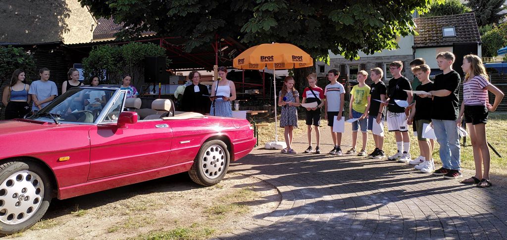 Unter dem Thema "Summertime" fand der diesjährige Gottesdienst im Oberlingarten statt. Bei sommerlichen Temperaturen stimmte der Gottesdienst auf die kommenden Ferien- und Urlaubstage ein. Die Kirchenband und die Konfirmand*innen gestalteten den Gottesdienst mit Pfarrerin Martina Lieb.